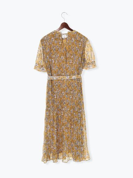 小花柄のプリーツワンピース プリーツワンピース 花柄 レトロ レディース 10代 20代 30代 アラサー Aライン カジュアル ゆったり ハイウエスト ウエストマーク 脚長効果 シフォン 膝丈 半袖 ボトルネック ベルト 透け感 シースルー イエロー ワンサイズ リボン 春夏 パフスリーブ RB-Z07-00045