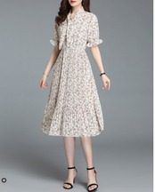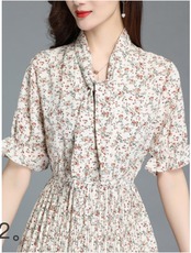 小花柄のプリーツワンピース プリーツワンピース 花柄 レトロ レディース 夏 10代 20代 30代 アラサー Aライン カジュアル きれいめ ハイウエスト ウエストマーク 脚長効果 シフォン 膝丈 半袖 ホワイト M L XL 2XL 3XL 大きいサイズ フリル フリル袖 リボン Vネック RB-Z07-00048