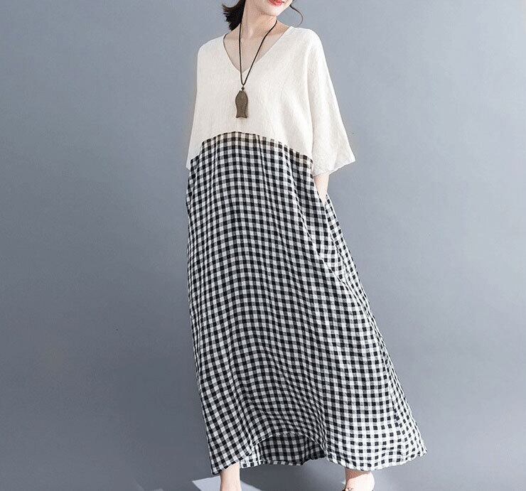 チェック柄 ふんわり Uネック 体型カバー 個性的 森ガール 大人可愛い エレガント RB-K07-0002
