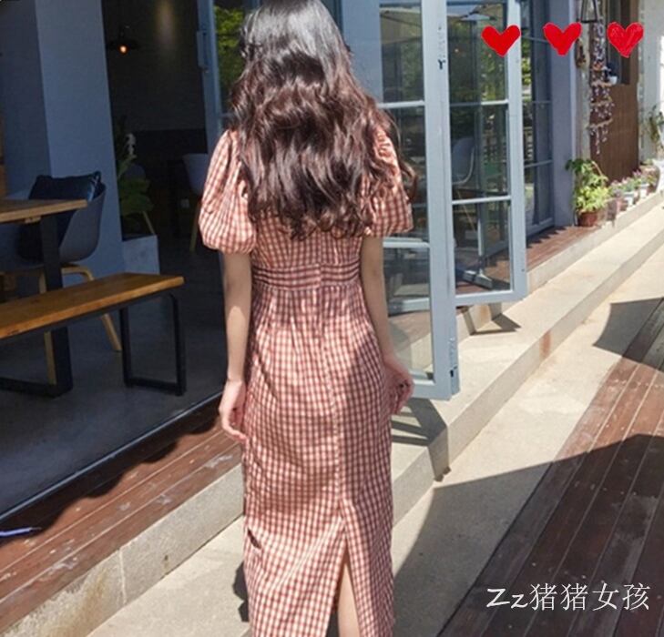 スクエアネック チェック柄 パフスリーブ 大人可愛い ふんわり感 夏ワンピ ミモレ丈 お出かけ 通学 デート RB-K07-0006