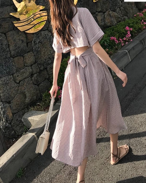 ウエストリボン 半袖 ギンガムチェック ミモレ丈 リゾート バックリボン 爽やか 個性的 大人可愛い RB-K07-0014