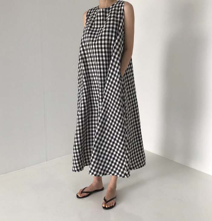 フレンチスリーブ 体型カバー ふんわり フレア ギンガムチェック ロング丈 春夏 大人可愛い ノースリーブ RB-K07-0030