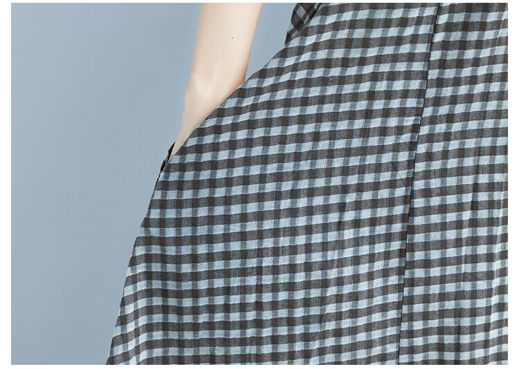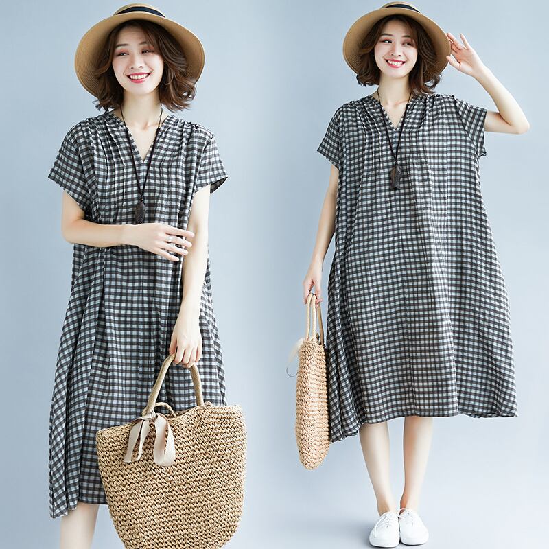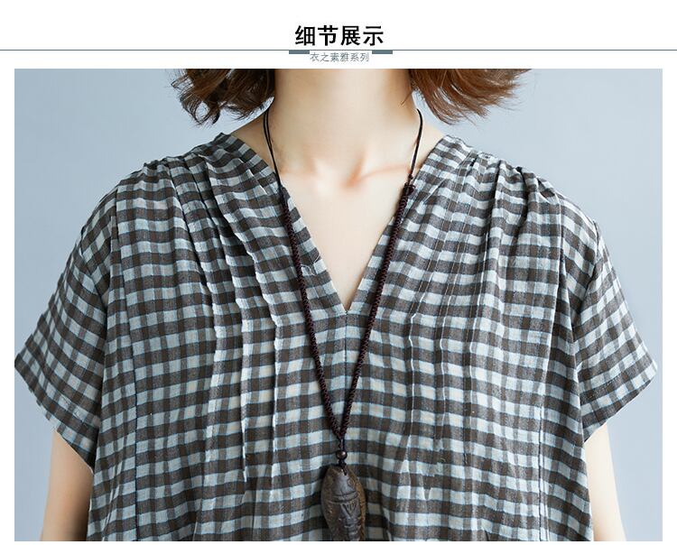 Vネック ポケット付き 透け感 半そで ギンガムチェック 透け感 膝丈 ふんわり ビックシルエット カジュアル 普段着 RB-K07-0043