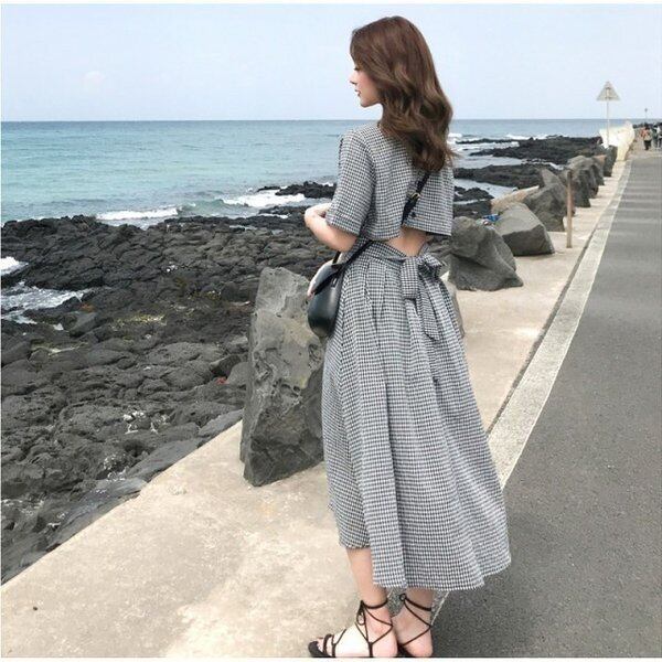背中あき チェック柄 ミモレ丈 バックリボン 個性的 夏 リゾート 大人かわいい 海 RB-K07-0015