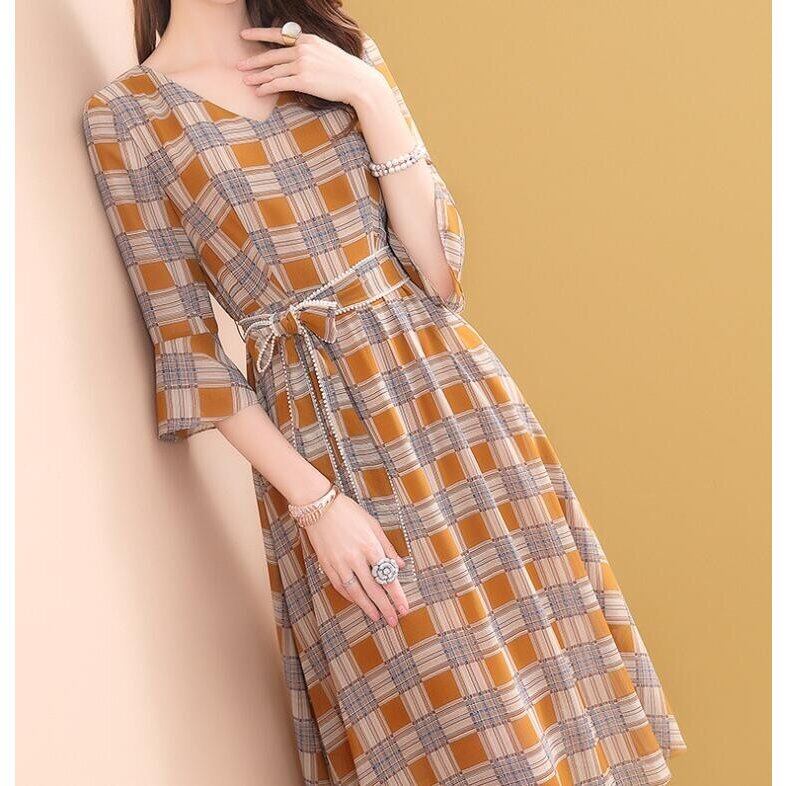 韓国風 七分袖 ロング丈 ウエストリボン 大人かわいい 個性的 きれいめ チェック柄 お呼ばれ Vネック RB-K09-0023
