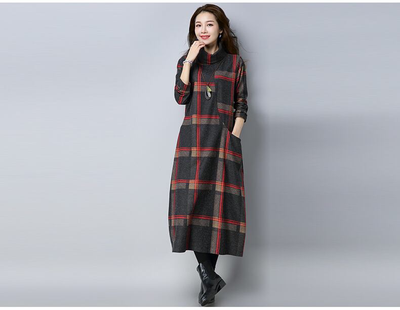 ゆったり タートルネック チェック柄 ふんわり Aライン きれいめ 綿 フリース ひざ丈 上品 お出かけ 普段着 RB-K09-0040