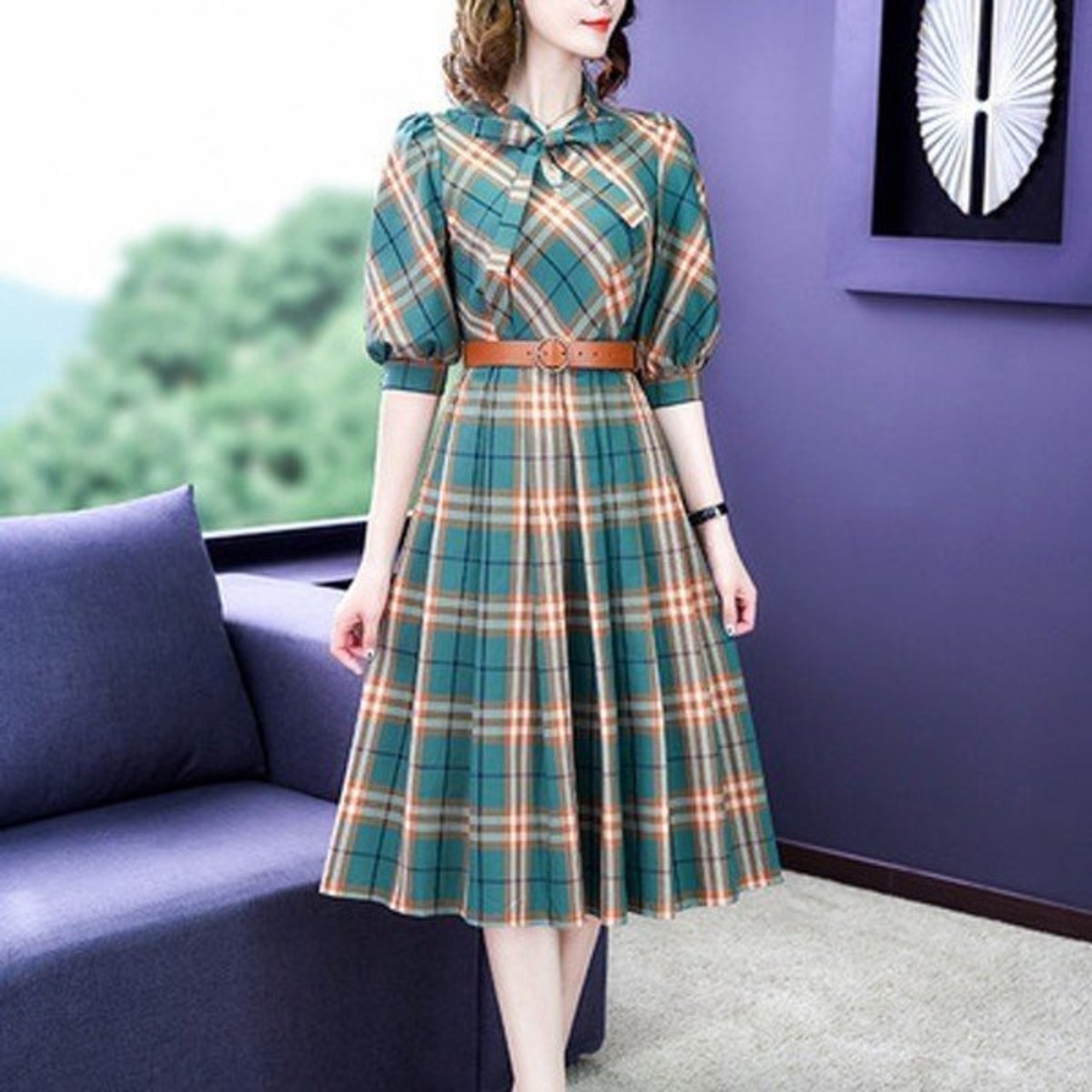 ウエストベルト チェック柄 七分袖 高見せ 上品 重ね着風 着痩せ Aライン 女性らしい 大人かわいい 二次会 お呼ばれ RB-K09-0048