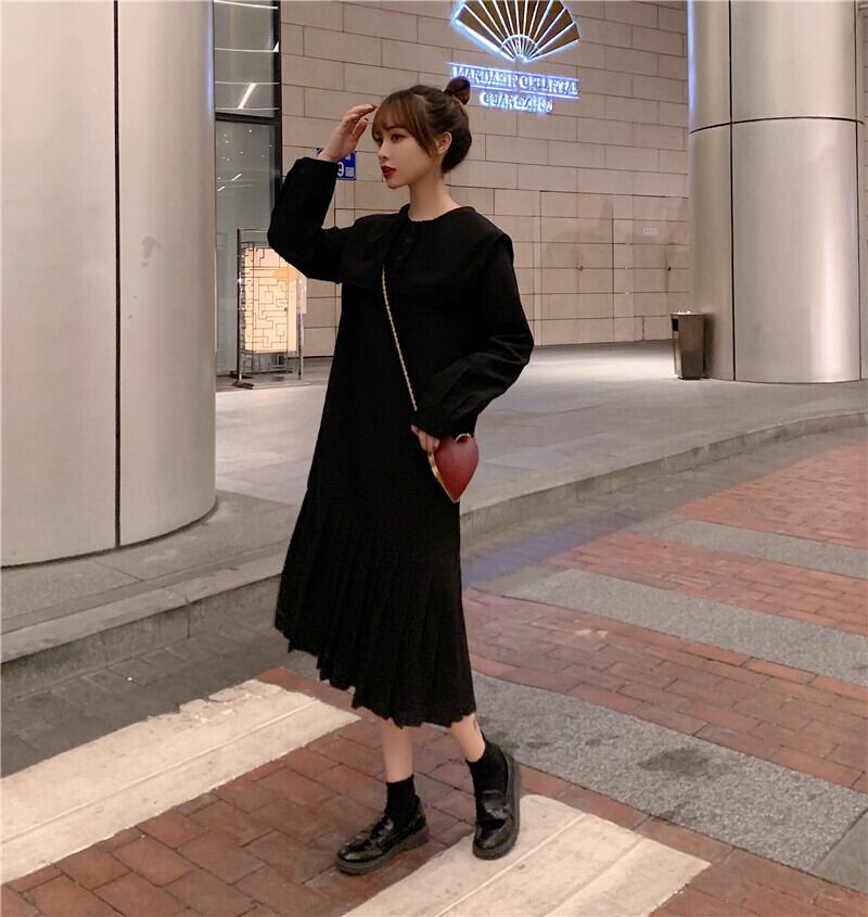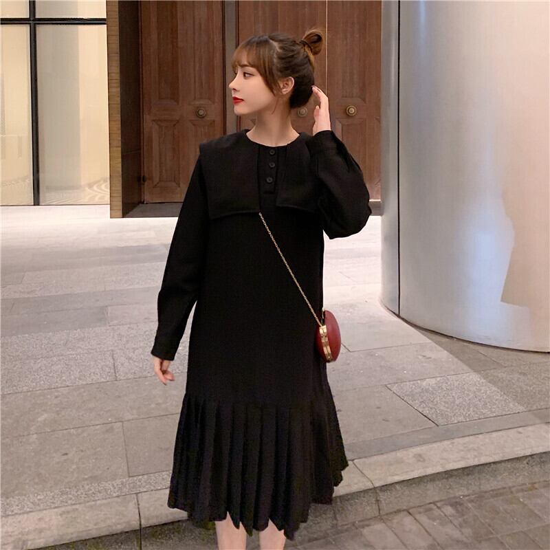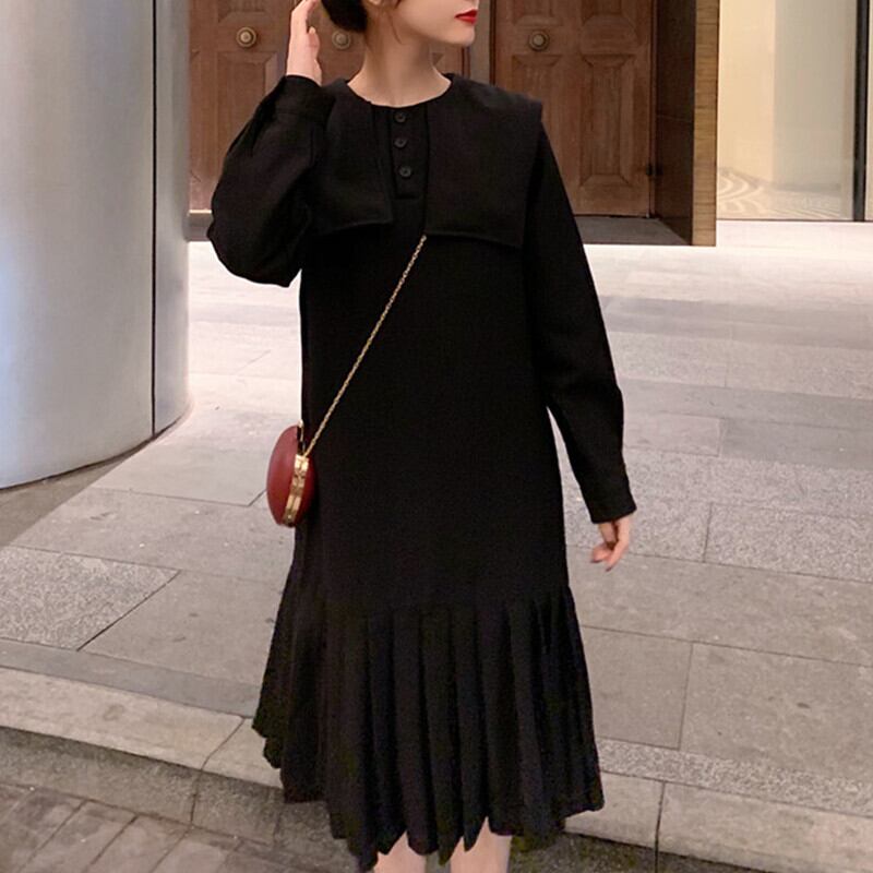 セーラーカラー 膝丈 プリーツワンピース 切替 長袖 ビッグカラー ブラックコーデ ローウエスト シンプル ガーリー 体型カバー 大きいサイズ 春 秋 RB-A09-0001