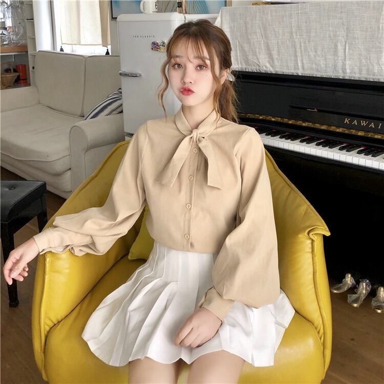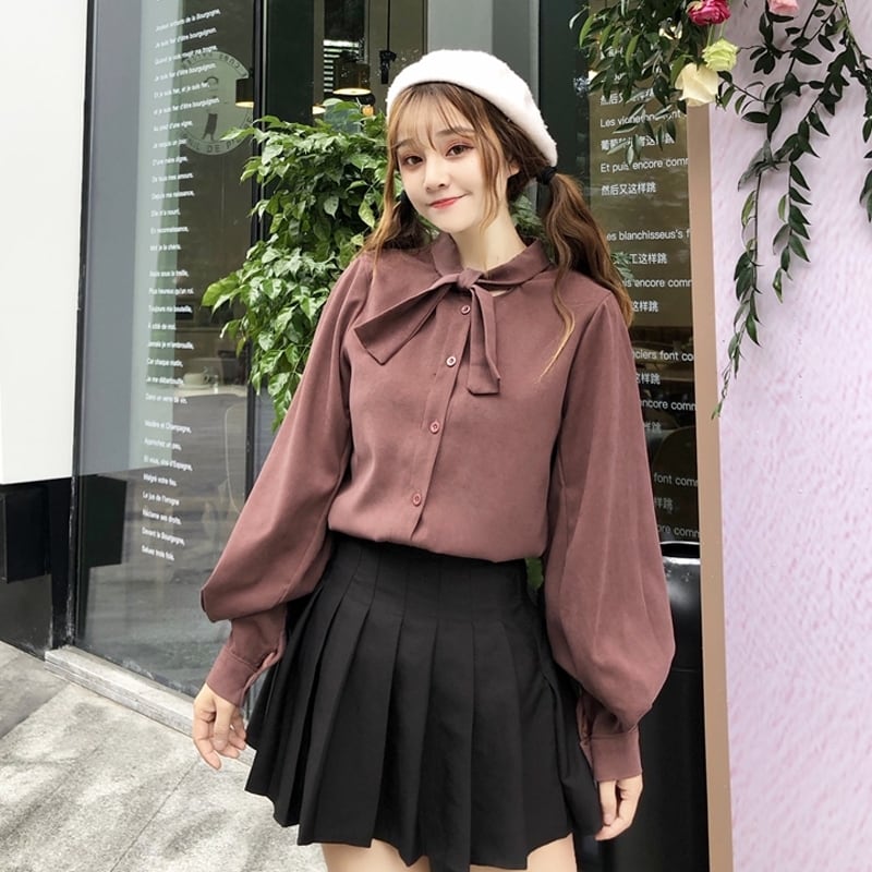 ボリューム袖 リボンタイ ブラウス 袖コンシャス 無地 ガーリー クラシカル シック お嬢様 お出かけ デート お呼ばれ 通学 秋 冬 トップス RB-A09-0006