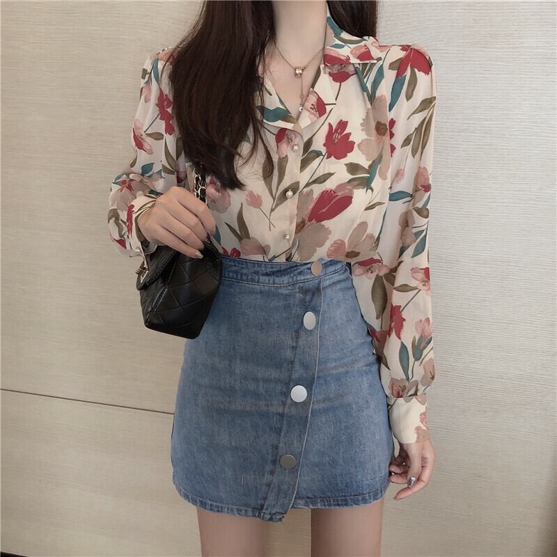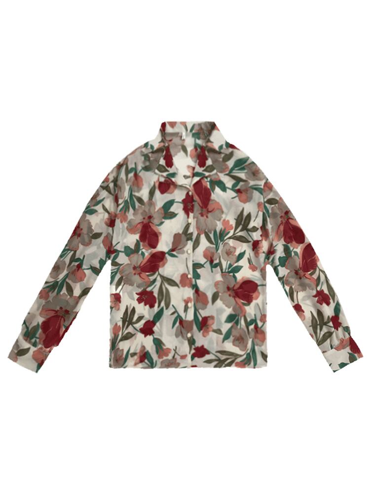 花柄 シフォン 長袖 ブラウス シャツ 開襟 オープンカラー フラワープリント ボタニカル シック エレガント ビジューボタン 大人女子 通勤 お出かけ デート 春 秋 トップス RB-A09-0007