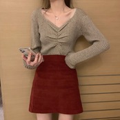 Vネック 長袖 リブニット ニットソー ギャザー シャーリング ショート丈 デコルテ見せ 鎖骨見せ 切替 カジュアル セクシー インナー 秋 冬 トップス RB-A09-0008
