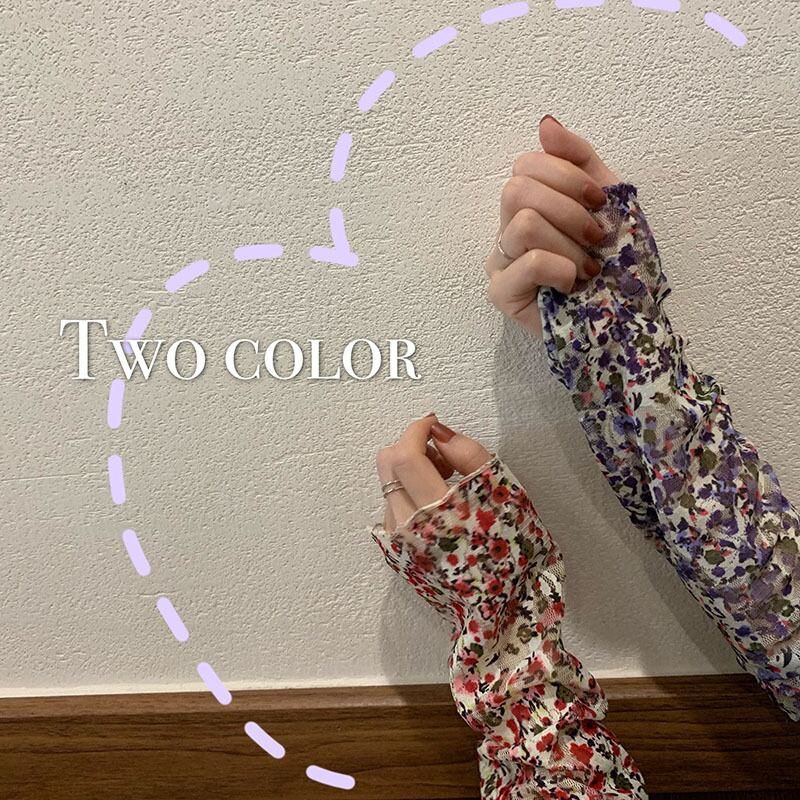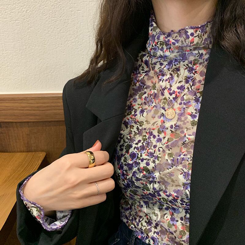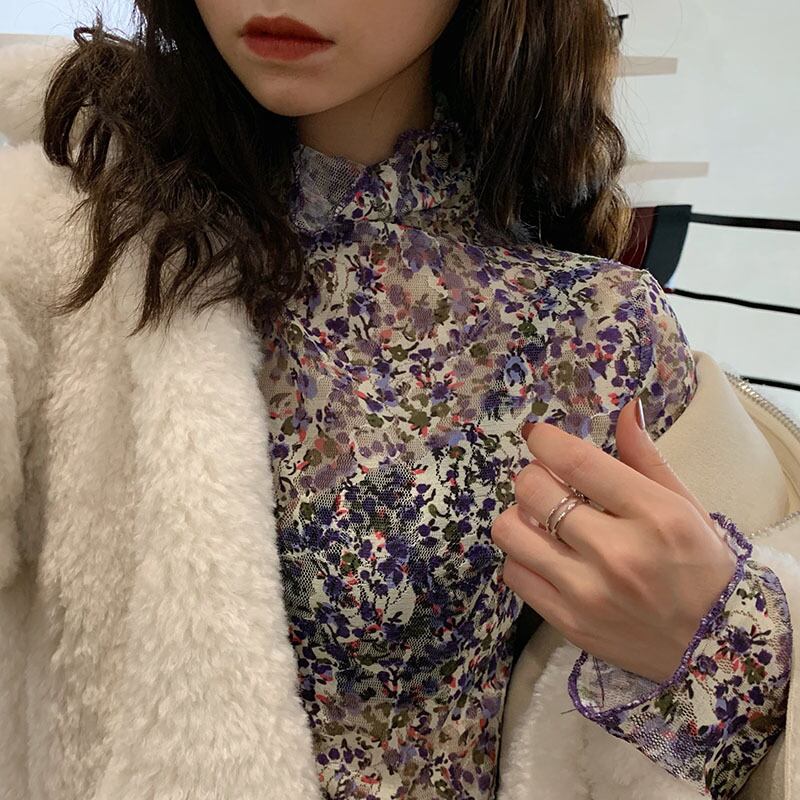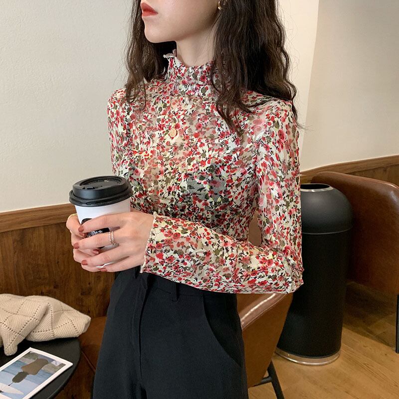 韓国風 ハイネック 花柄 メッシュTシャツ カットソー 長袖 透け感 フローラル スリム インナー レイヤード 重ね着 お出かけ デート 春 秋 冬 RB-A09-0012