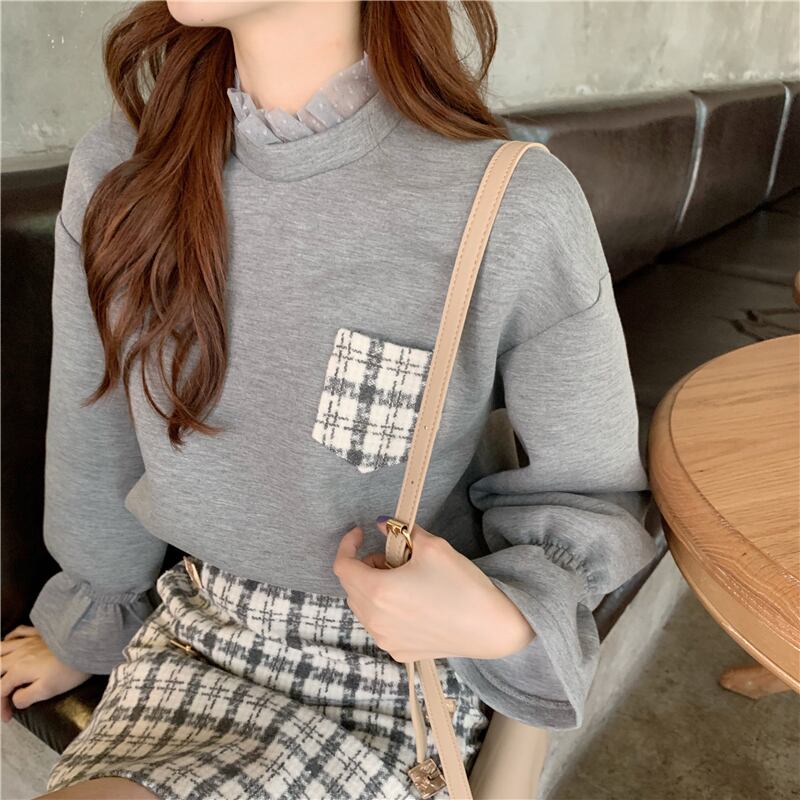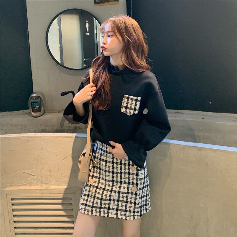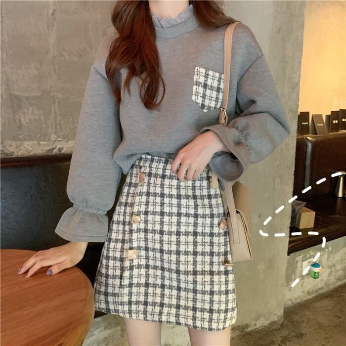 チェック柄 セットアップ ツーピース レース付き スタンドカラー 長袖 プルオーバー スウェット キャンディスリーブ ミニスカート Aライン ボタン カジュアル シック 大人可愛い お出かけ デート 通学 秋 冬 RB-A09-0026