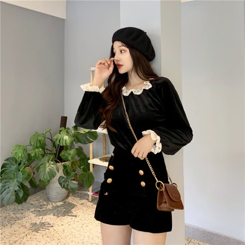 レース付き レトロ ベルベット トップス プルオーバー カットソー ラグランスリーブ ラウンドネック 大人可愛い ガーリー フェミニン きれいめ シック お出かけ デート 秋 冬 RB-A09-0027