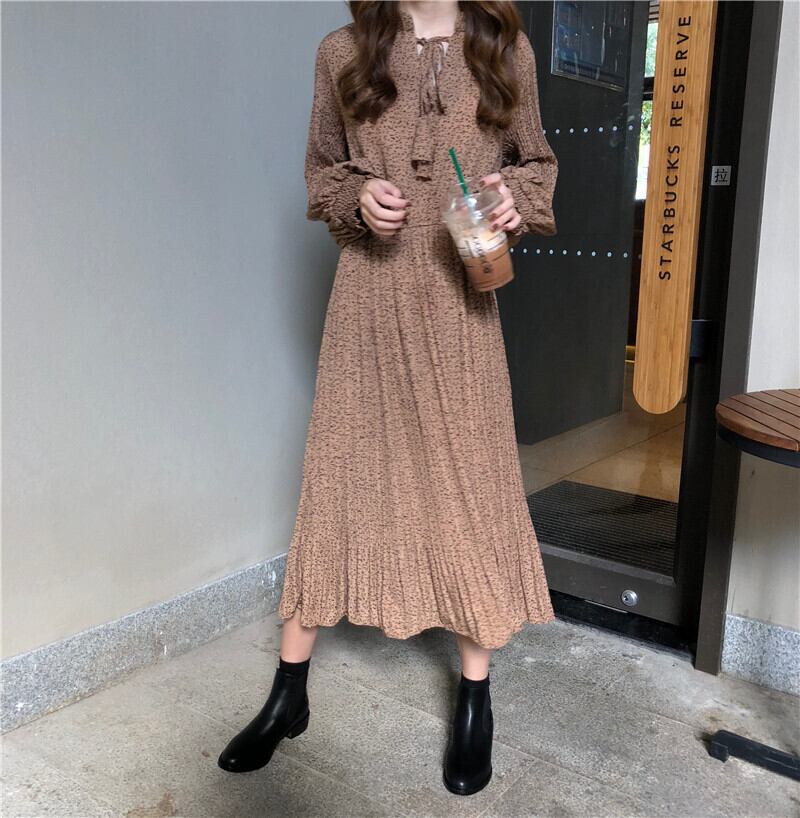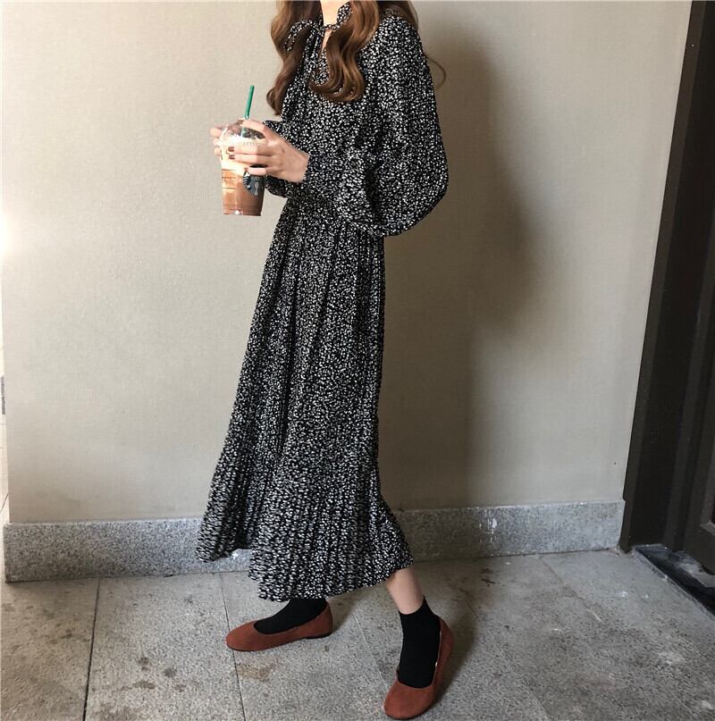 小花柄風 シフォン ワンピース 長袖 ミモレ丈 プリーツワンピ ウエストゴム Aライン マオカラー 落ち感 きれいめ 上品 フェミニン 大人かわいい お出かけ デート お呼ばれ 秋 RB-A09-0033
