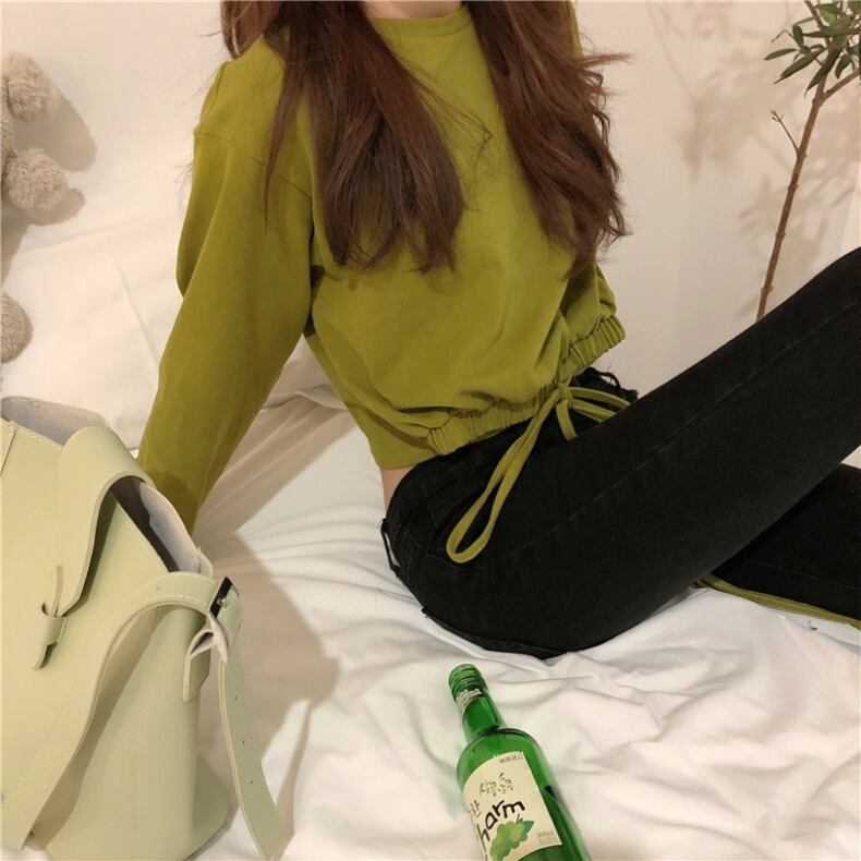 ショート丈 カットソー ラウンドネック 長袖 ウエストゴム ウエストリボン 無地 カジュアル セクシー 肌見せ シンプル デイリー 普段着 お出かけ 通学 着回し 秋 RB-A09-0041