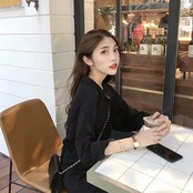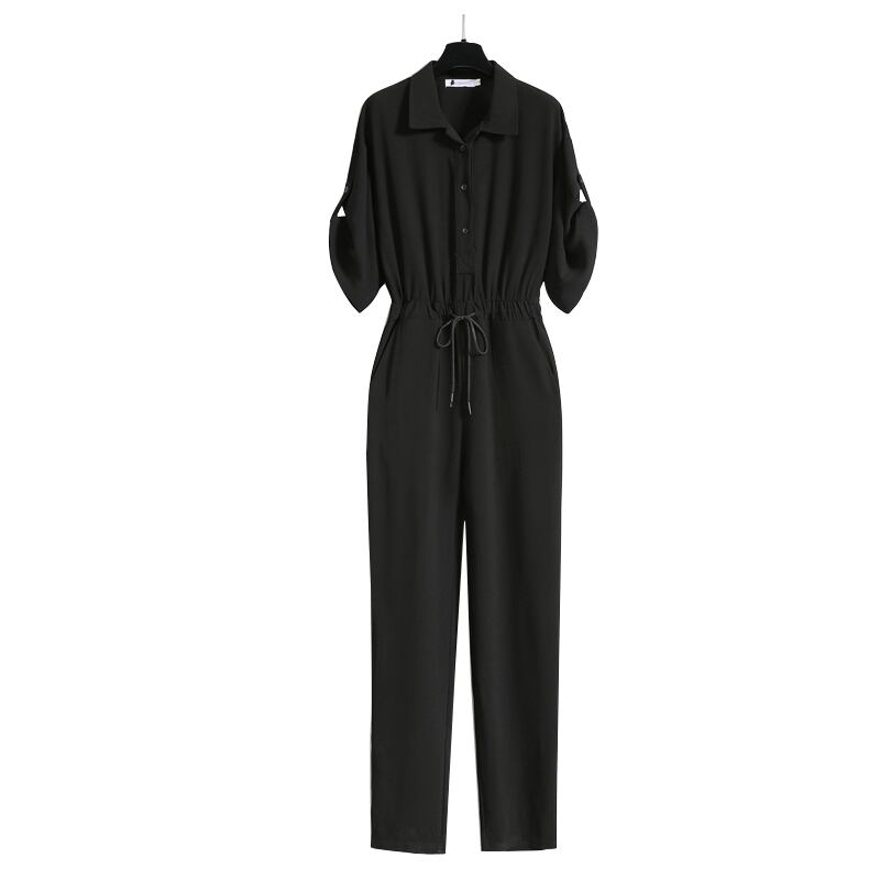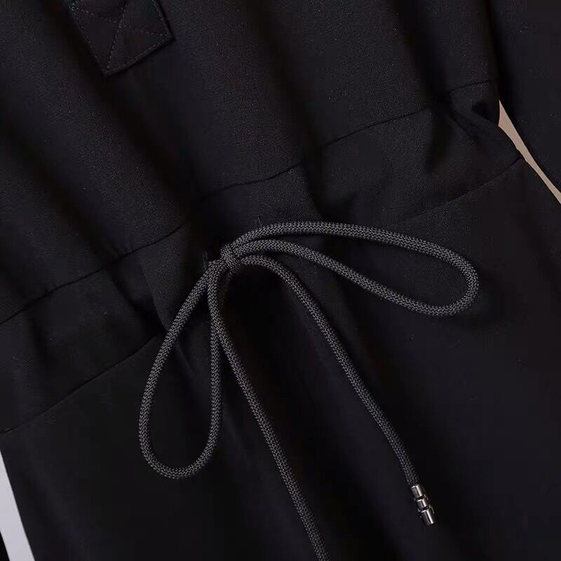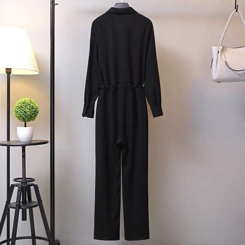 ブラック ロングオールインワン ジャンプスーツ 長袖 シャツカラー ウエストコード 無地 シンプル カッコいい 大人女子 オシャレ ラクチン お出かけ レジャー 旅行 春 秋 RB-A09-0051