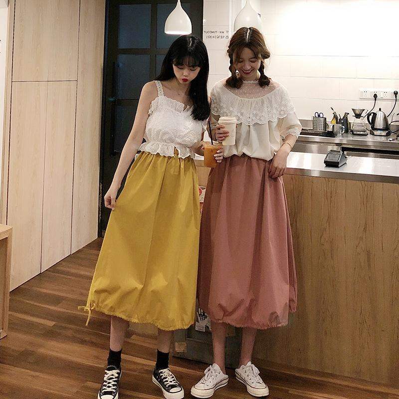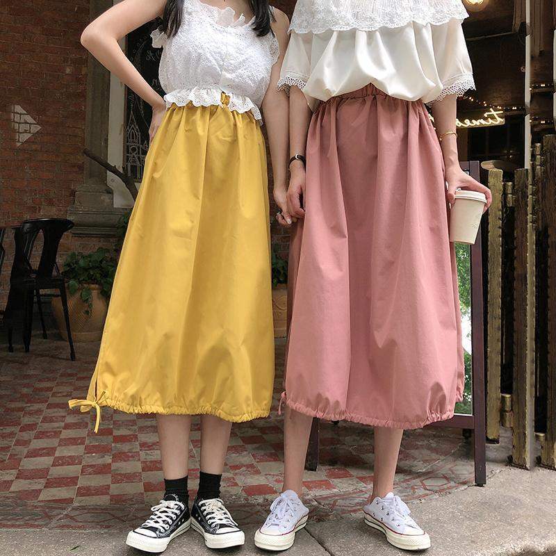 裾絞り バルーンスカート ウエストゴム ミモレ丈 ドローストリング 無地 シンプル カジュアル ゆったり 下半身カバー かわいい お出かけ デート 通学 春 夏 秋 RB-A09-0056