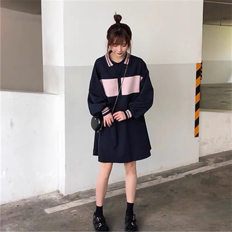 ポロ襟 カットソーワンピース ライン入り ひざ丈 長袖 ハーフボタン ゆったり リラックス 体型カバー カジュアル スポーティー お出かけ デート レジャー 通学 春 秋 大きいサイズ RB-A09-0063