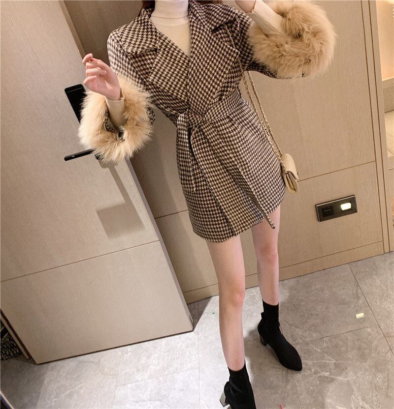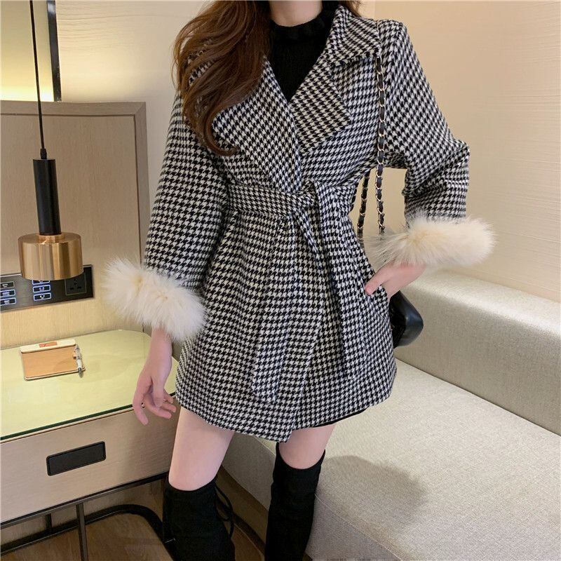 千鳥格子柄 ウール調 ハーフコート ウエストベルト 袖ファー クラシカル レトロ シック 上品 きれいめ エレガント お出かけ デート パーティー お呼ばれ 秋 冬 アウター RB-A09-0071