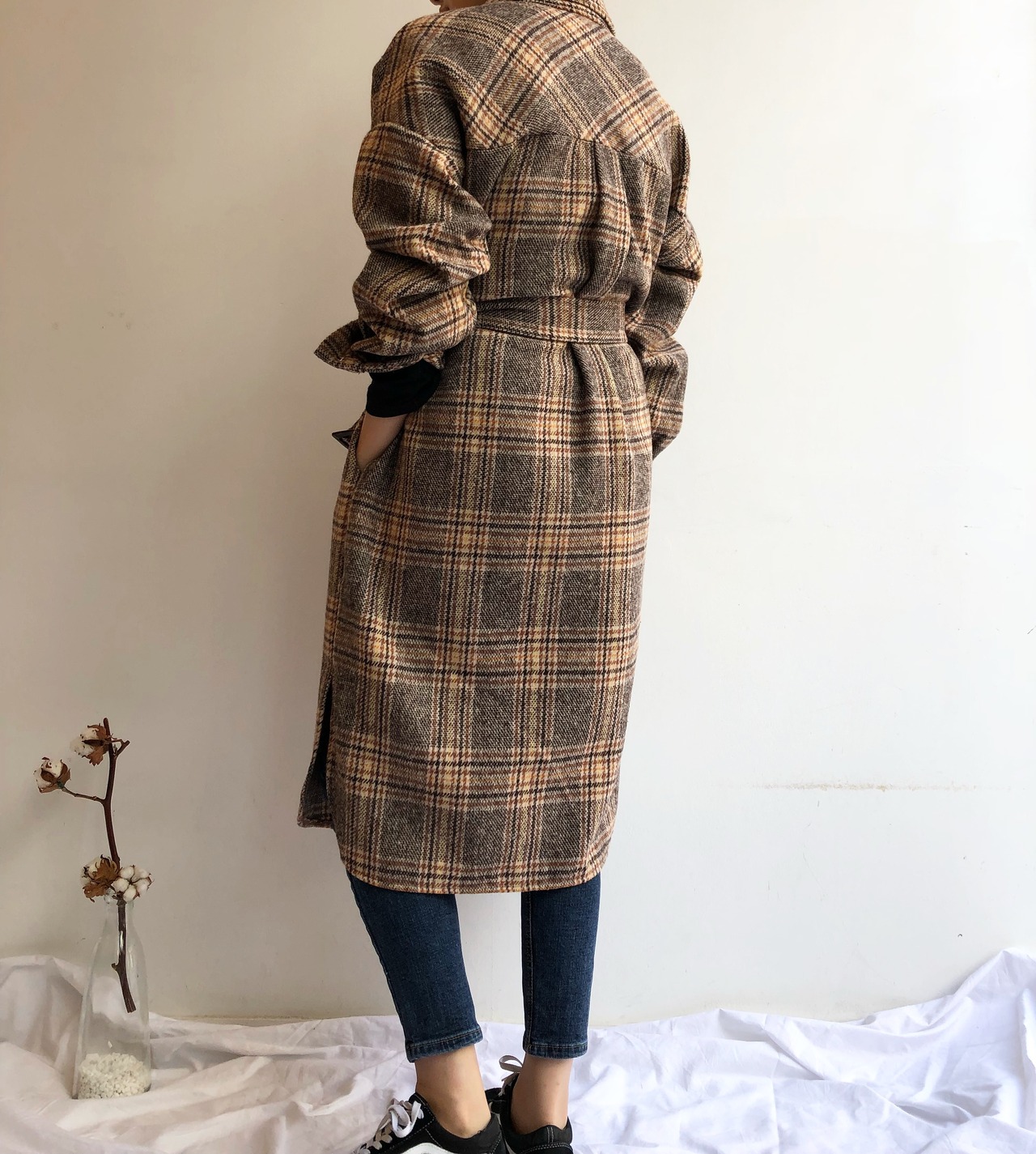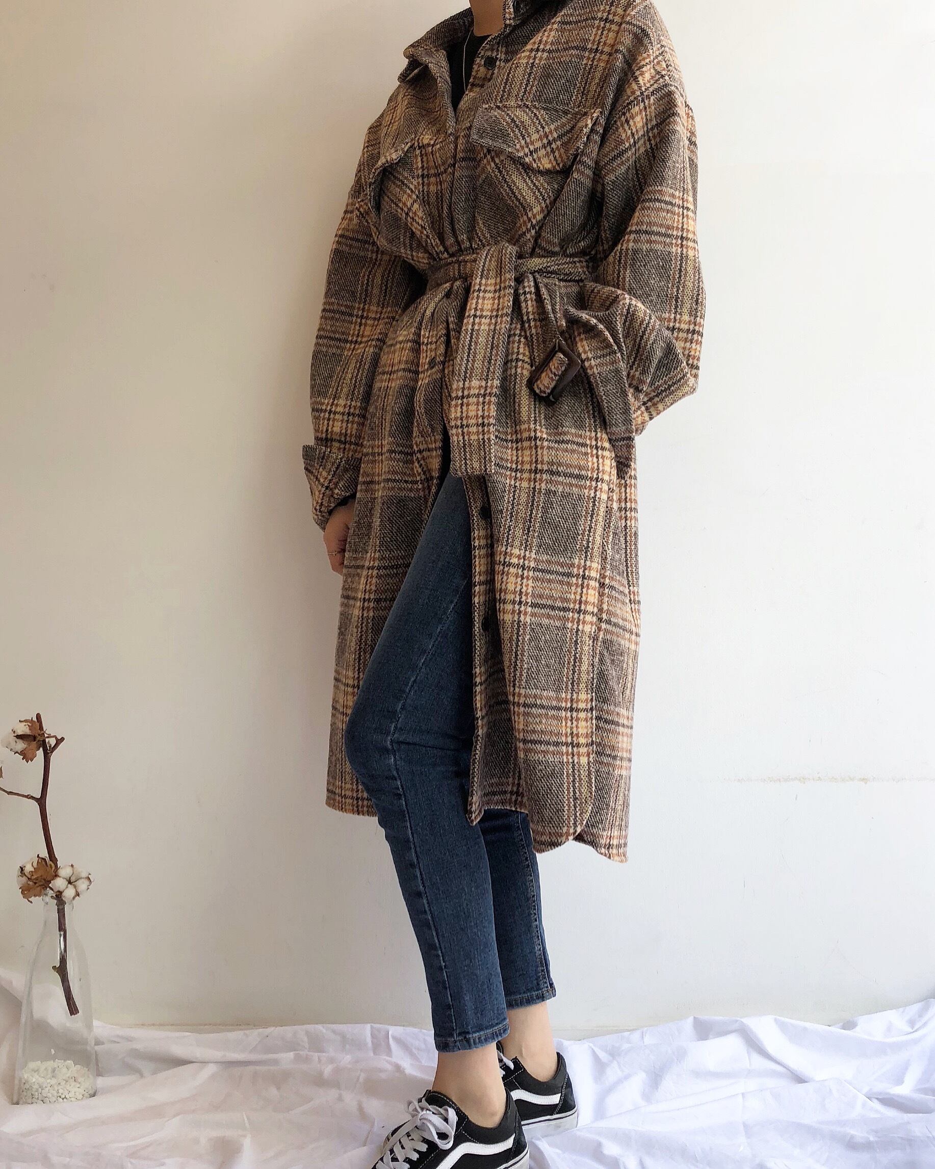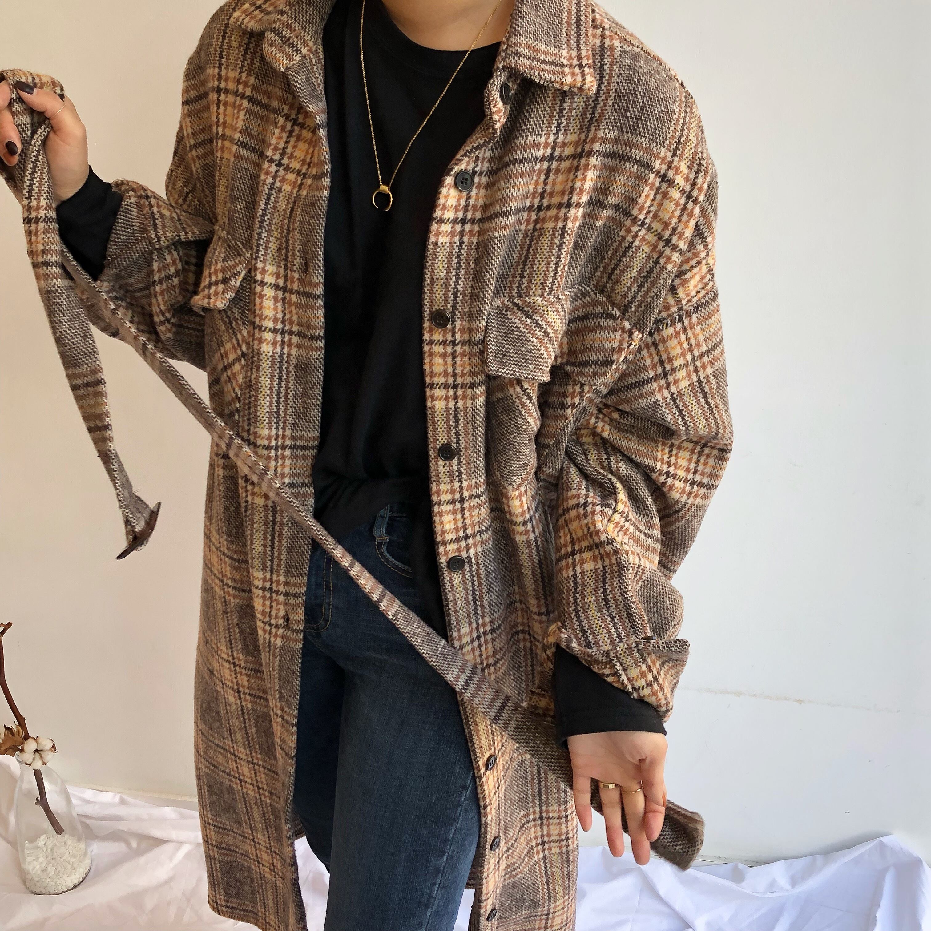 チェック柄 シャツコート シャツジャケット ミモレ丈 長袖 ベルト付き サイドポケット カジュアル トラッド 英国調 おじカワイイ デイリー お出かけ デート 女子会 通学 秋 冬 アウター RB-A09-0079