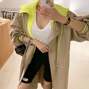 フード付き ジップアップコート ロング丈 ロングジャケット フェイクレイヤード ネオンカラー コントラストカラー ボリューム袖 袖コンシャス カジュアル スタイリッシュ ストリート オシャレ 大人カジュアル お出かけ デート 女子会 秋 アウター RB-A09-0081