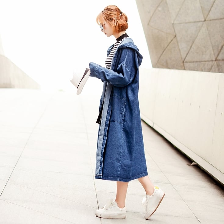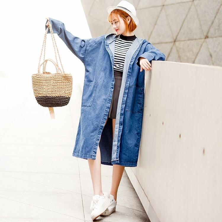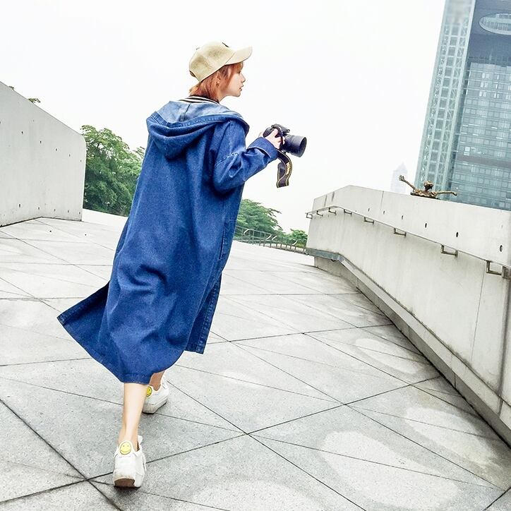 デニム フード付き コート ミモレ丈 ガウンコート ボタンなし ゆったり オーバーサイズ シンプル カジュアル ボーイッシュ デイリー 普段着 お出かけ デート 通学 レジャー 秋 アウター RB-A09-0082