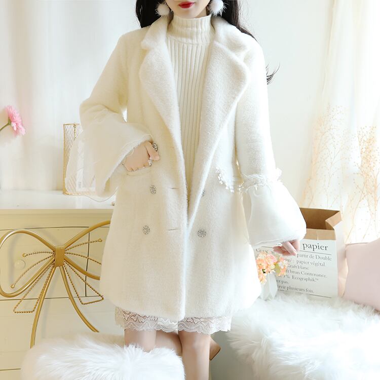 トランペットスリーブ ダブルボタン コート ハーフコート チュールレース 装飾レース ビジューボタン ふわふわ 無地 ガーリー ロマンティック sweet ラブリー 甘い お出かけ デート イベント 秋 冬 アウター RB-A09-0093