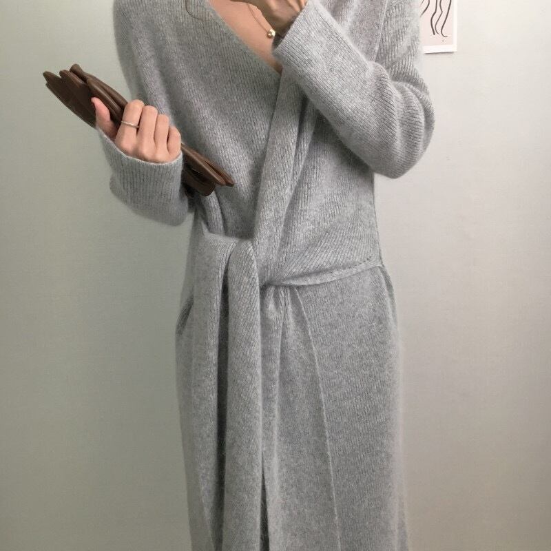 ニットワンピース 秋 冬 エレガント きれいめ 30代 40代 50代 ウエストストラップ Vネック カシュクール風 長袖 ロング丈 ロングワンピ シンプル 大人女子 お出かけ デート RB-A10-0002