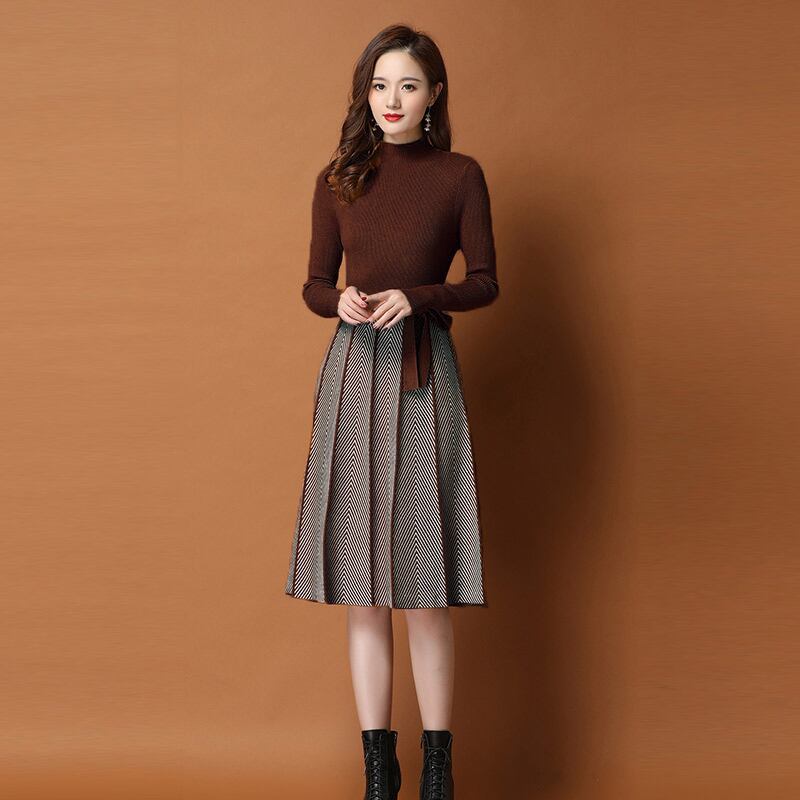 ニットワンピース 秋 冬 エレガント きれいめ 30代 40代 50代 切替 プリーツ ボトルネック 長袖 ひざ丈 スリム ウエストリボン 個性的 シック 上品 大人女子 通勤 デート 女子会 お呼ばれ RB-A10-0006