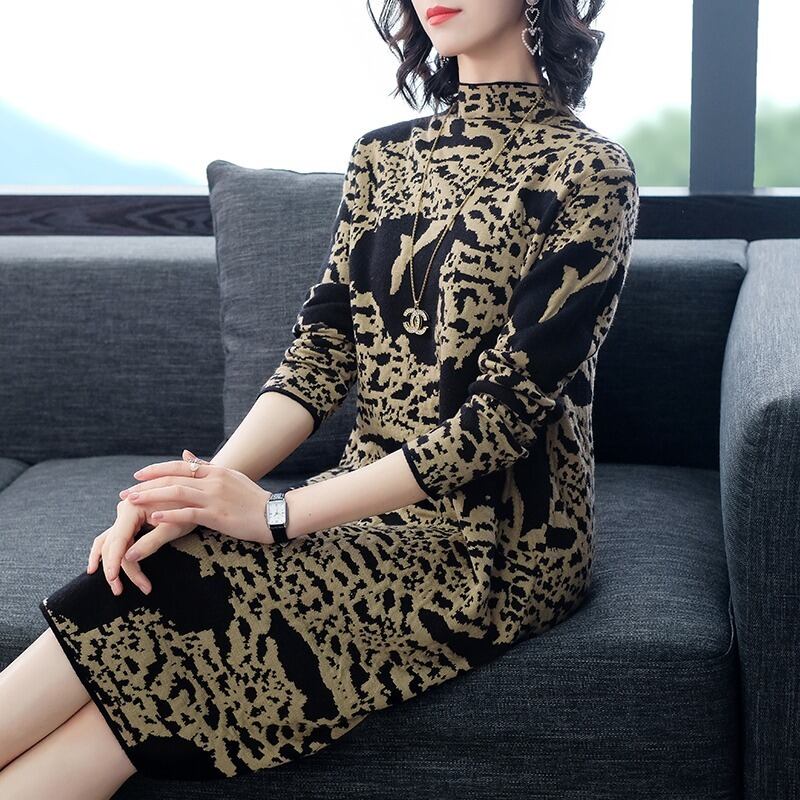 ニットワンピース 秋 冬 エレガント きれいめ 30代 40代 50代 レオパード柄風 長袖 ひざ丈 ゆったり 体型カバー シック スタイリッシュ オシャレ 大人女子 デート お出かけ お食事会 RB-A10-0017