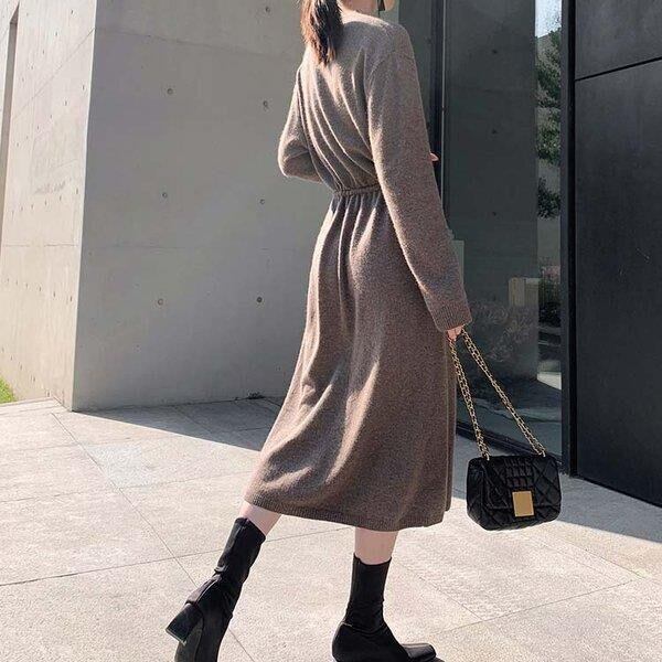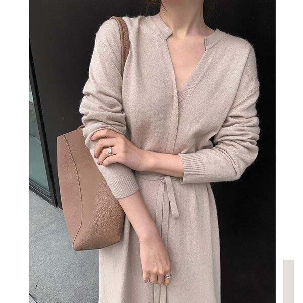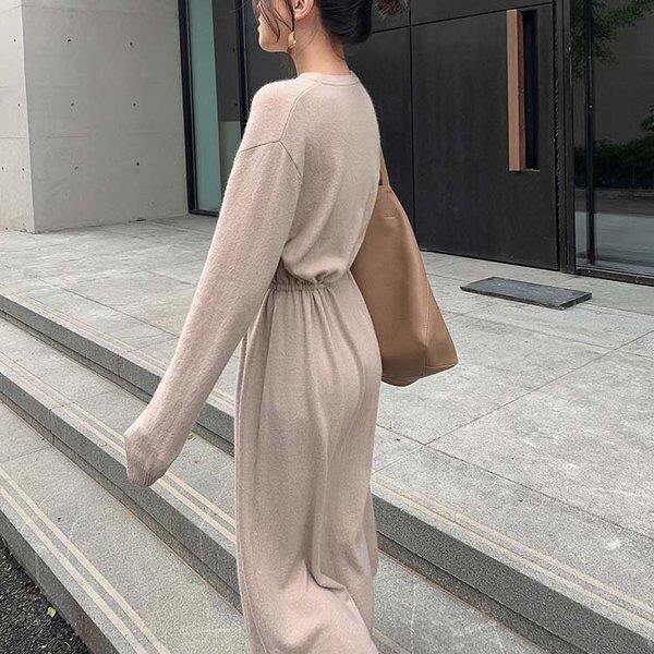 ニットワンピース 秋 冬 エレガント きれいめ 30代 40代 50代 キーネック 長袖 ミモレ丈 ウエストリボン 無地 ゆったり ぬけ感 こなれ感 シンプル 上品 大人女子 通勤 オフィス デート 女子会 RB-A10-0020