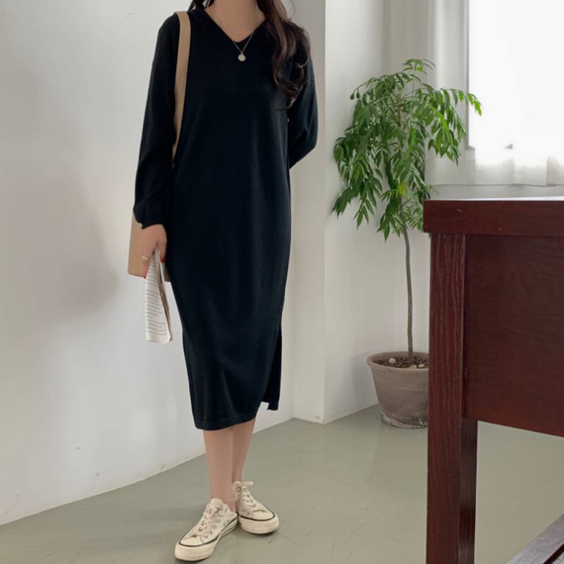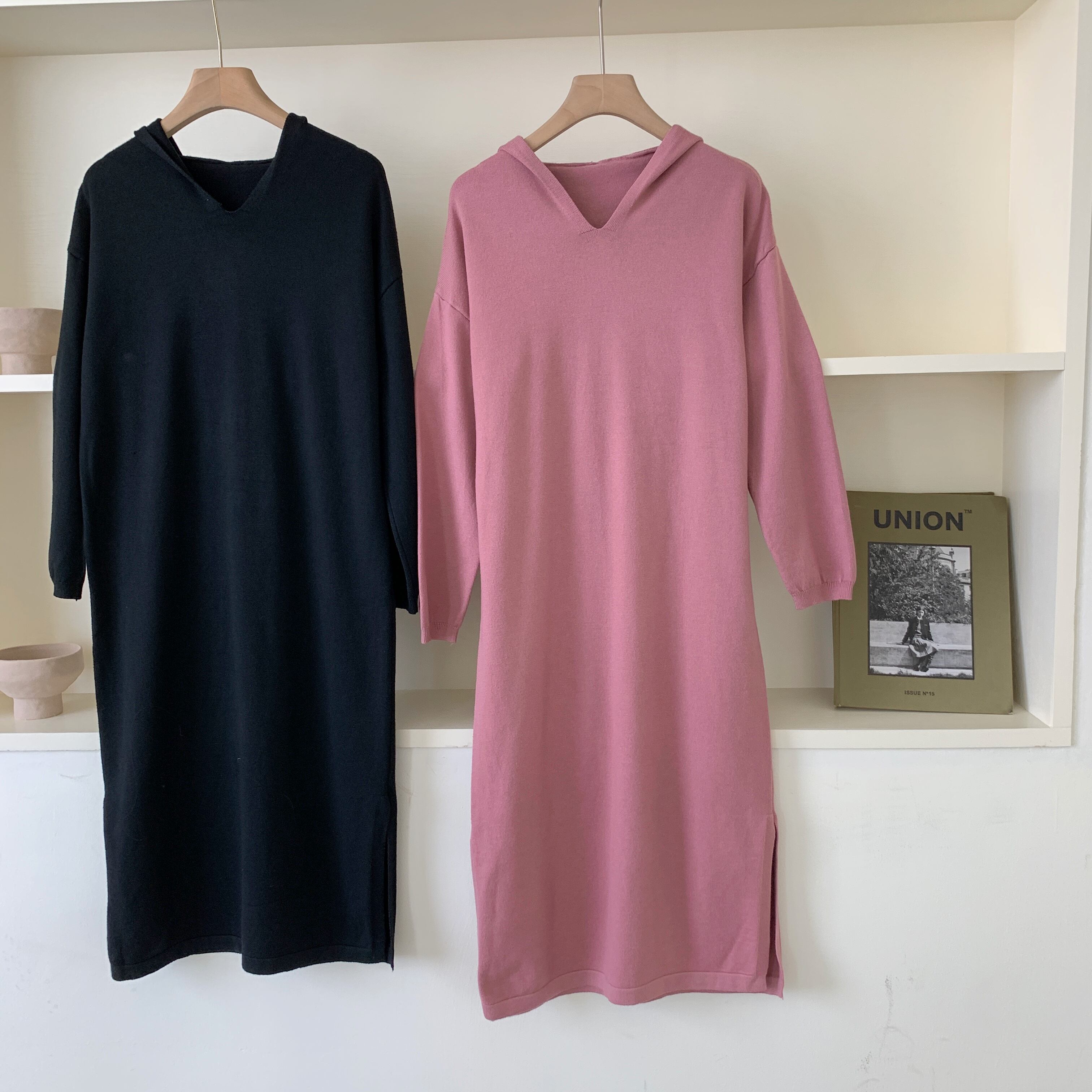 ニットワンピース 秋 冬 エレガント きれいめ 30代 40代 50代 Vネック フード付き ロング丈 サイドスリット Iライン ゆったり 無地 シンプル カジュアル 大人可愛い お出かけ デート 通学 女子会 着やせ RB-A10-0021