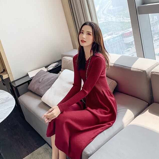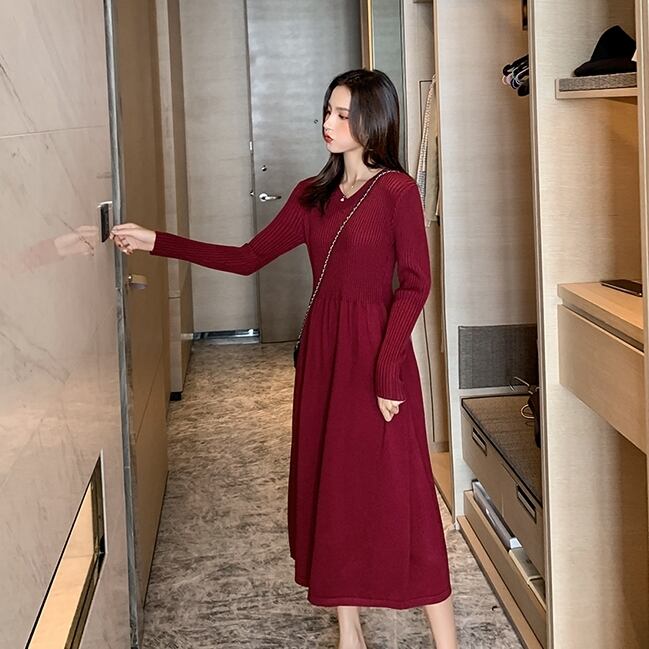 ニットワンピース 秋 冬 エレガント きれいめ 30代 40代 50代 Vネック 長袖 Aライン ロング丈 リブニット 切替 無地 シンプル カジュアル 着回し お出かけ デート 女子会 RB-A10-0024