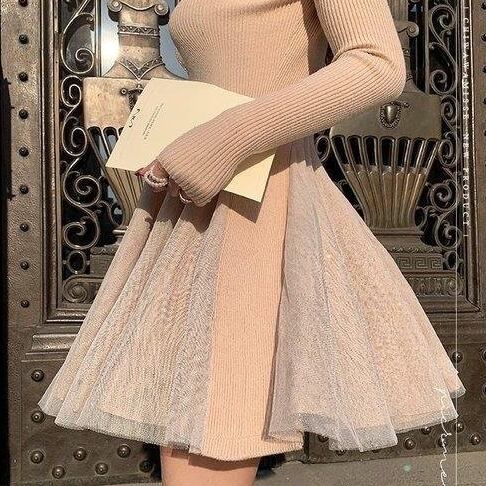 ニットワンピース 秋 冬 エレガント きれいめ 30代 40代 50代 ラウンドネック 長袖 ミニ丈 サーキュラースカート 異素材MIX 切替 スリム フェミニン ガーリー かわいい パーティー 二次会 デート RB-A10-0025