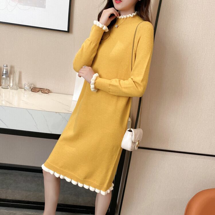 ニットワンピース 秋 冬 エレガント きれいめ 30代 40代 50代 無地 ボトルネック 長袖 ひざ丈 ボックスシルエット 縁フリル ニットドレス ガーリー 上品 かわいい デート お出かけ 通勤 お呼ばれ RB-A10-0047
