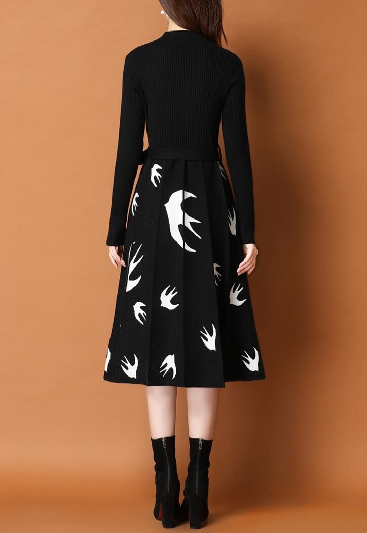 ニットワンピース 秋 冬 エレガント きれいめ 30代 40代 50代 ボトルネック 長袖 ミモレ丈 リブニット プリーツ 切替 鳥柄 Aライン シック モダン デート お出かけ 通勤 お呼ばれ 大人女子 RB-A10-0051