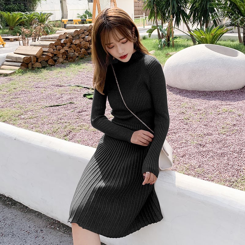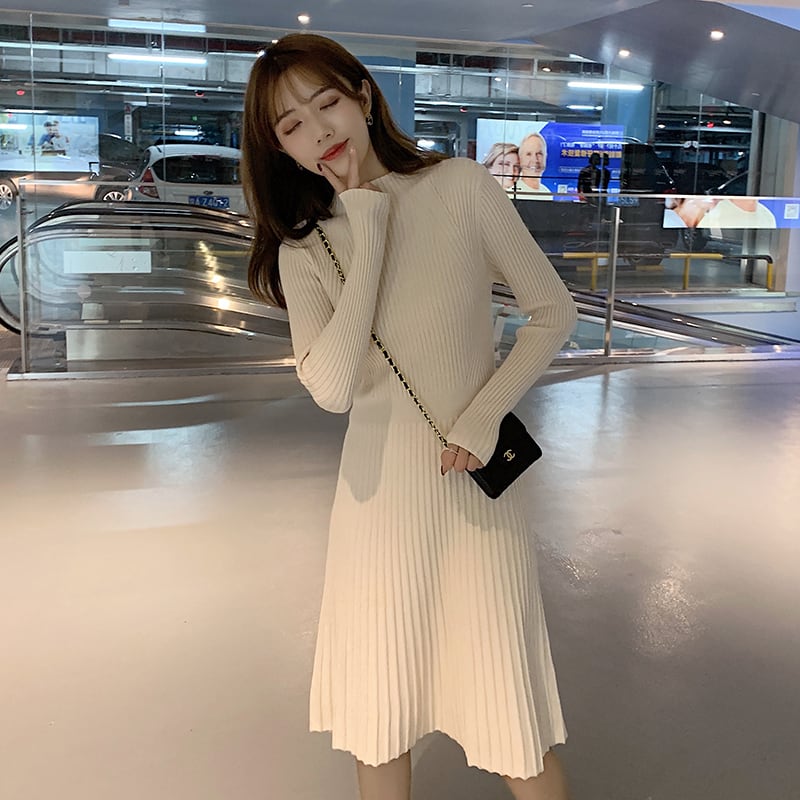 ニットワンピース 秋 冬 エレガント きれいめ 30代 40代 50代 ボトルネック 長袖 ひざ丈 リブニット Aライン 無地 シンプル カジュアル デイリー お出かけ デート 女子会 RB-A10-0052