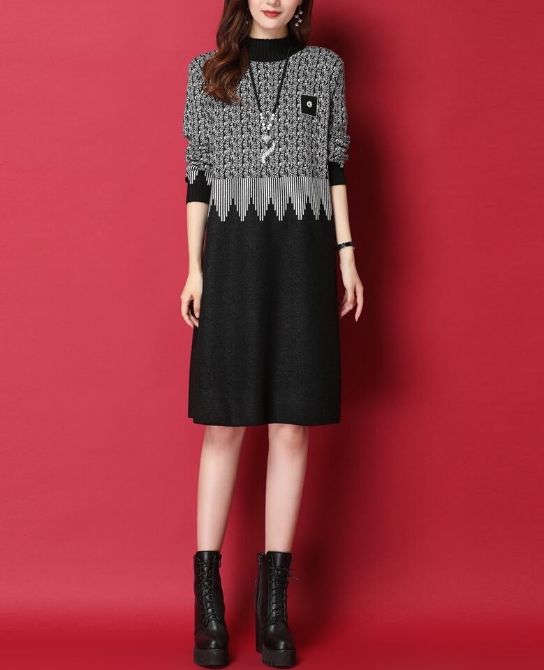 ニットワンピース 秋 冬 エレガント きれいめ 30代 40代 50代 ボトルネック 長袖 ミモレ丈 ボックスシルエット モダン シック 切替 体型カバー 通勤 お出かけ 女子会 RB-A10-0058