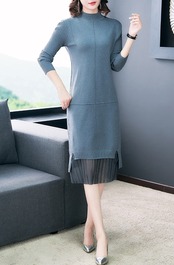 ニットワンピース 秋 冬 エレガント きれいめ 30代 40代 50代 異素材MIX 切替 長袖 ボトルネック ミモレ丈 裾プリーツ ボックスシルエット シック 上品 大人女子 通勤 お出かけ デート 女子会 お呼ばれ RB-A10-0065