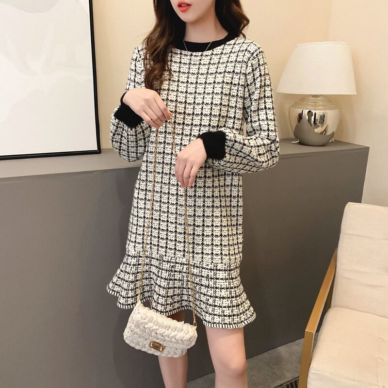 ニットワンピース 秋 冬 エレガント きれいめ 30代 40代 50代 チェック柄 ラウンドネック 長袖 ミニ丈 フラウンス マーメイドシルエット 切替 シック トラッド オシャレ 通勤 デート お出かけ 体型カバー RB-A10-0068