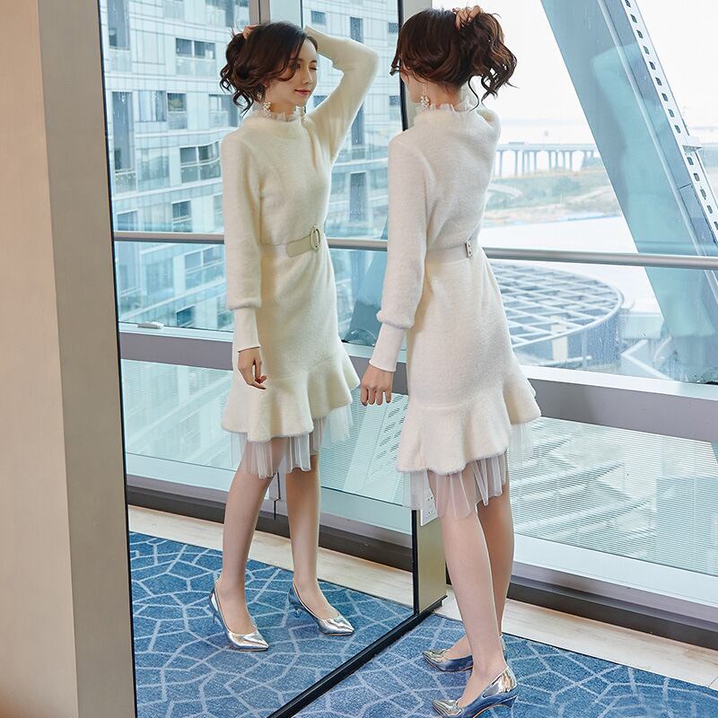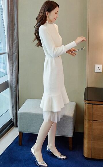 ニットワンピース 秋 冬 エレガント きれいめ 30代 40代 50代 無地 ミモレ丈 長袖 ふんわり チュールレース 裾フリル シンプル ガーリー 大人かわいい お出かけ デート 女子会 パーティー RB-A10-0071