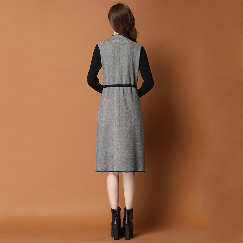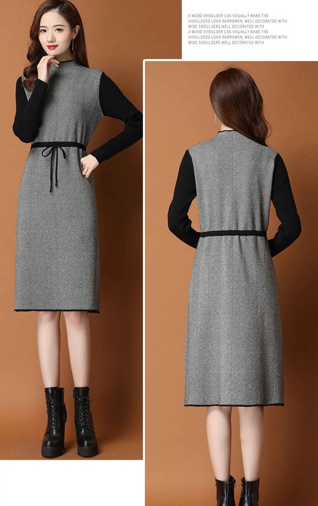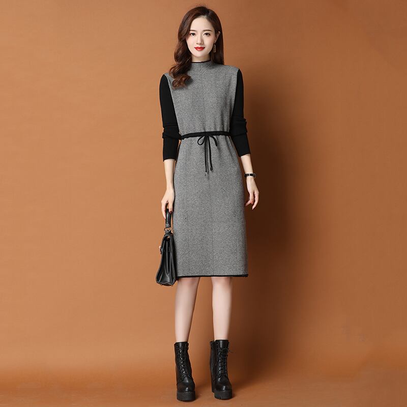 ニットワンピース 秋 冬 エレガント きれいめ 30代 40代 50代 切替 ボトルネック 長袖 ミモレ丈 ドローストリング ヘリンボーン シック モダン 上品 デート お出かけ 通勤 オフィス RB-A10-0073