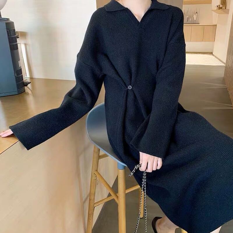 ニットワンピース 秋 冬 エレガント きれいめ 30代 40代 50代 襟付き スキッパー 長袖 ミモレ丈 無地 ルーズ ウエストシェイプ オシャレ 個性的 シンプル 体型カバー 通勤 デート お出かけ 女子会 RB-A10-0077