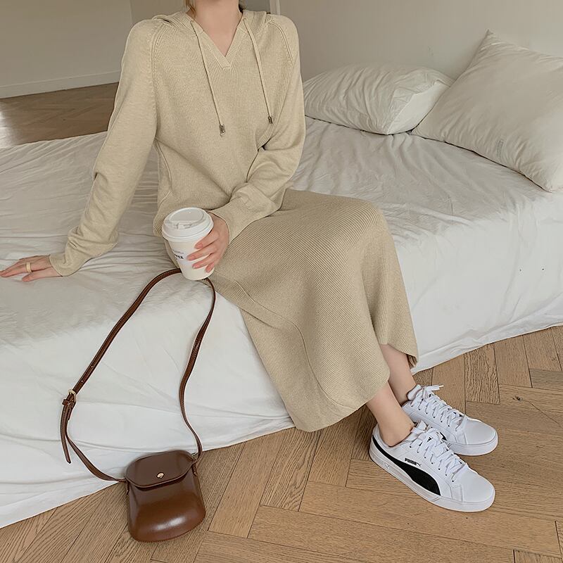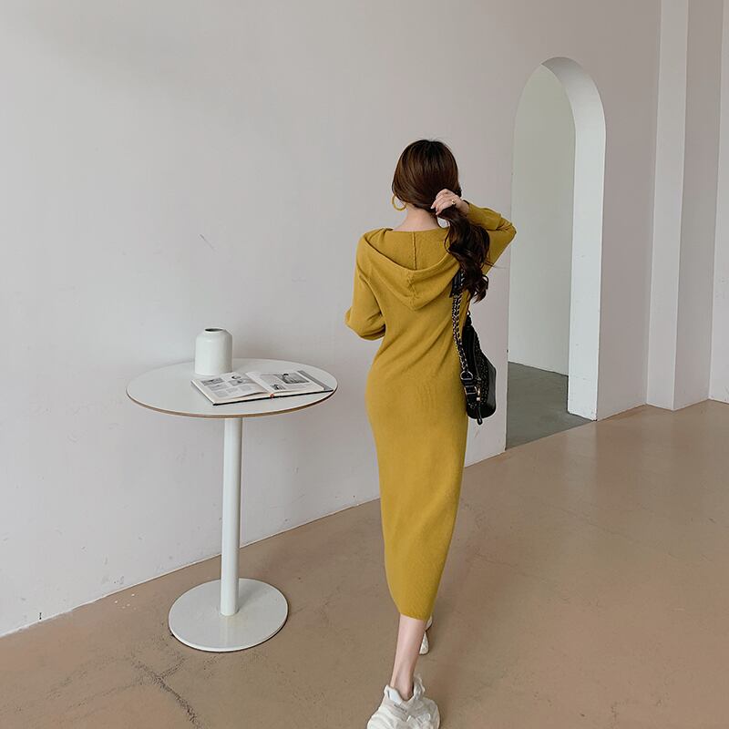 ニットワンピース 秋 冬 エレガント きれいめ 30代 40代 50代 フード付き 長袖 ロング丈 無地 スリム シンプル カジュアル らくちん 普段着 お出かけ デート RB-A10-0078
