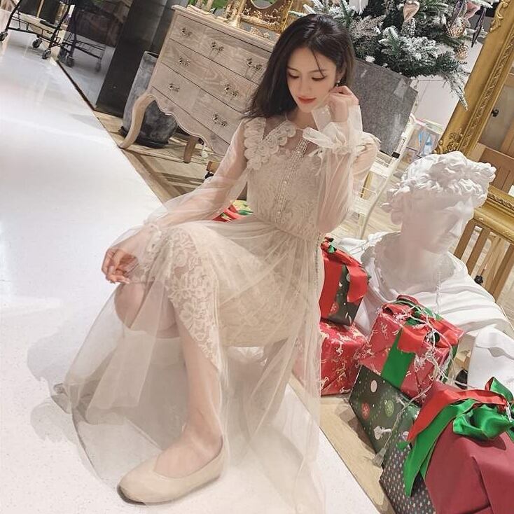 レディースファッション 40代 ファッション 秋冬 エレガント きれいめ 大人 30代40代50代 ワンピース ドレス チュールレース 花柄レース 透け感 シアー ウエスト切替 ミモレ丈 長袖 ガーリー 大人可愛い 甘め デート お呼ばれ パーティー RB-A10-0202