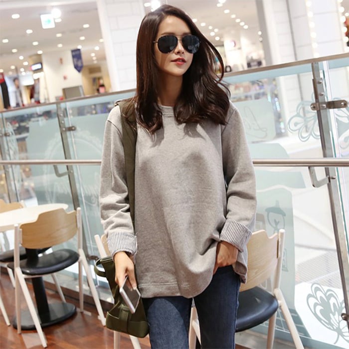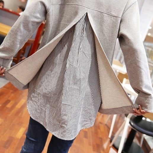 フェイクレイヤード ドッキングトップス 長袖 トレーナー スウェット カットソー ラウンドネック 切替 無地 ストライプ柄 ゆったり ルーズ 体型カバー カジュアル 30代40代50代 秋 冬 RB-A12-0023