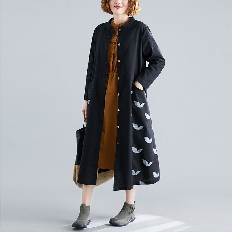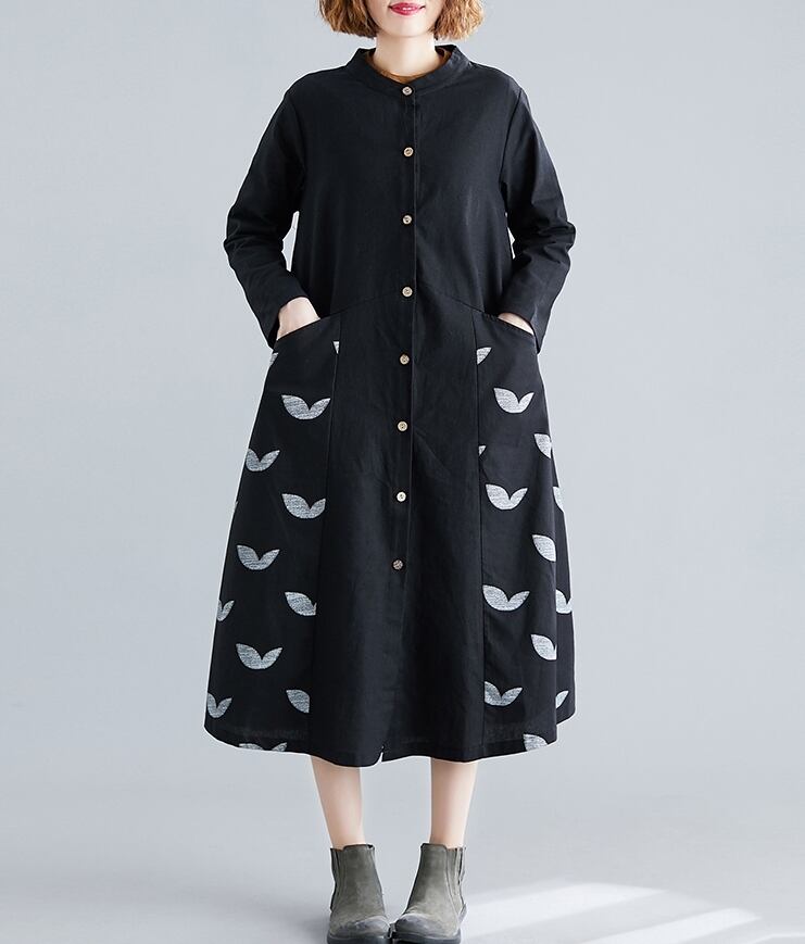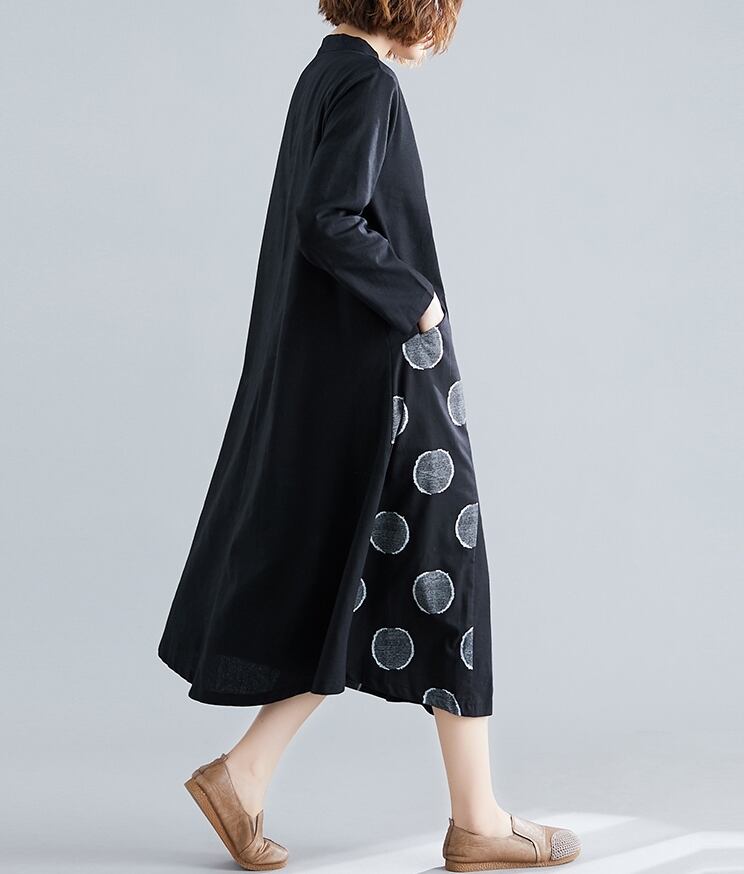 長袖 ワンピース ロングワンピース フロントボタン シャツワンピース バンドカラー プリント ブラックワンピ カジュアル ナチュラル 可愛い ゆったり 30代40代50代 秋 冬 RB-A12-0038