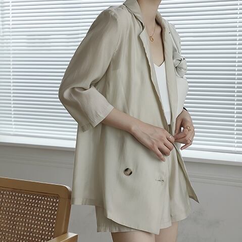 セットアップ ショートパンツ 20代 30代 40代 くすみカラー ツーピース 2点セット パンツスーツ ダブルボタン ジャケット 7分袖 薄手 カジュアル リラックス ナチュラル デート レジャー 旅行 春夏 RB-R3-A02-0012