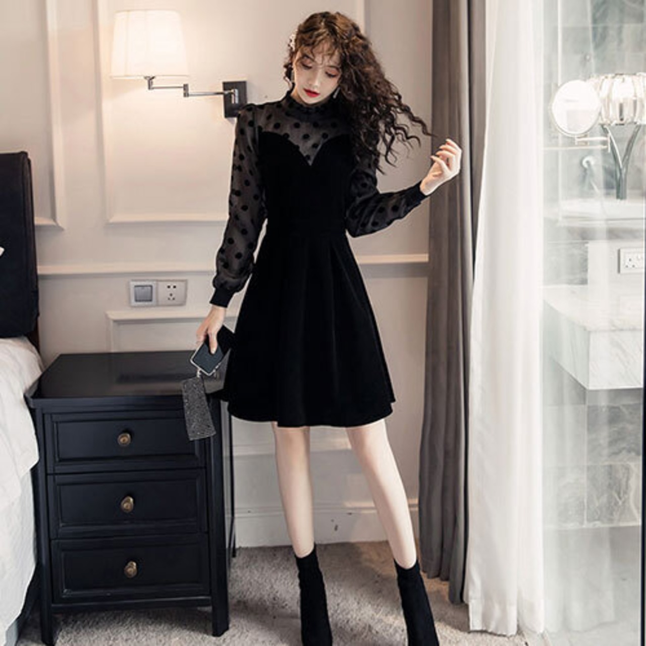 ワンピース ドット ベルベット ポリエステル ブラック長袖 フォーマル ワンピース 二次会 通勤 OL 30代 40代 着痩せ RB-R3-04-SA03-0032